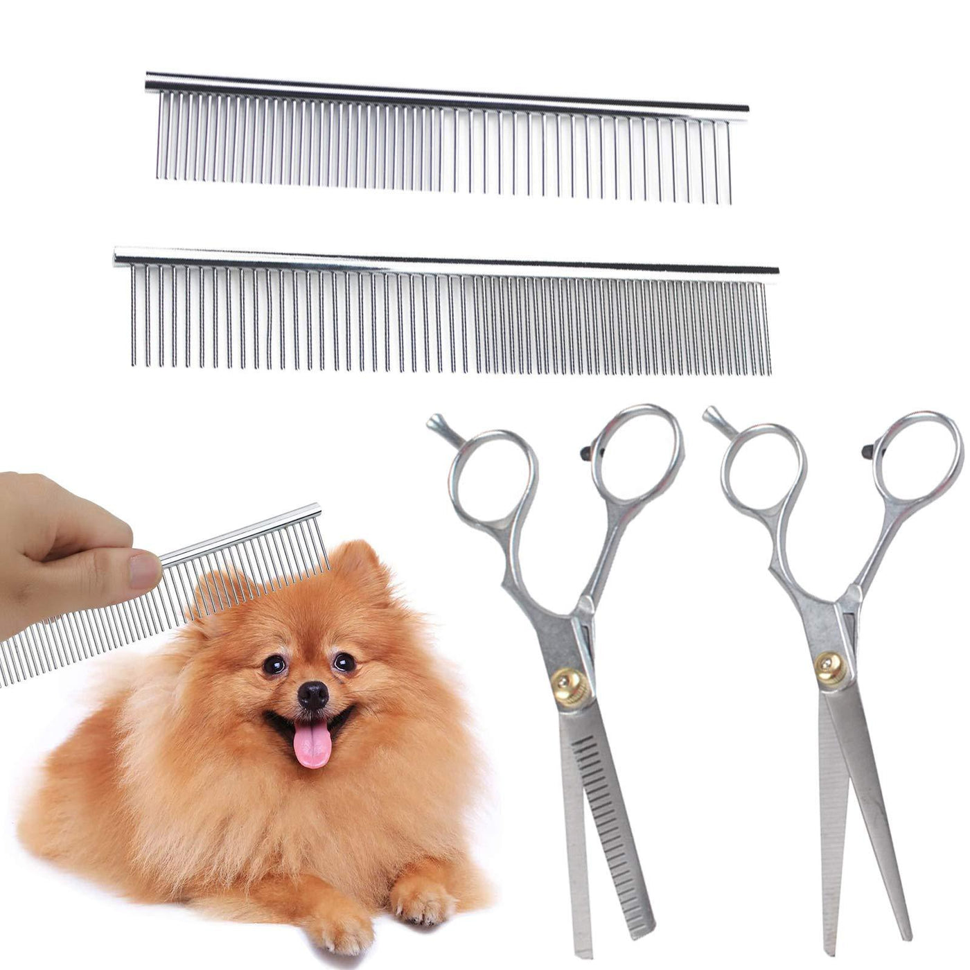 Features ♡Straight scissors are used for cutting pet hair flat parts. Be used for all types of grooming needs, great for finishing, shaping, and patterning.good for professional and beginner. ♡Thinning scissors are used to thin out hair. It has one fine-toothed blade and one cutting blade, which is mainly used to make the hair thinner, effectively remove the thickness of the hair. ♡Ergonomic design handle for long time holding without fatigue. ♡Rubber silencer on the handle, effectively lower the noise of metal collision. Specification: Colour:Silver Material: stainless steel Size:Straight scissors length 16cm; Thinning scissors length 15cm Comb size: Large comb19 x 3.5cm; Small comb 16.5 x 3 cm Warm Prompt 1.High quality steel, high sharpness, when you use the scissors,you must pay attention to safety and keep pet scissors away from children. 2.Can not Press hot water, gasoline, alcohol and other liquids and avoid placing in a humid environment. 3.Please clean and keep it properly after use. 4.Don't use them to cut metal objects.The scissors can only be used for hair trimming, otherwise it will shorten the life of using. 5.The measurement allowed error is +/- 1-3cm. Package Contents: 2 x Comb 2 x Scissors