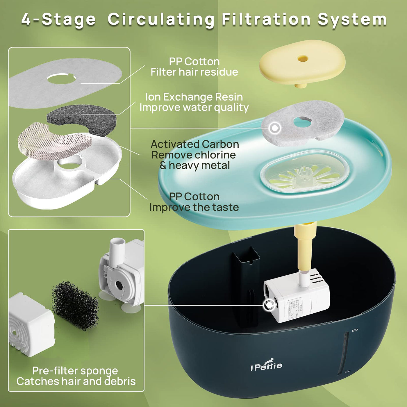 - 4-Stage Circulating Filtration System - Filtered pet drinking fountain provides healthy, fresh and oxygen-enriched waterfall.