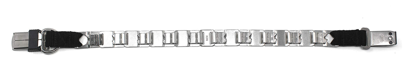Size:19in | Color:Stainless Steel The Herm Sprenger NECK TECH Stainless Steel Prong Collar with Quick Release Buckle is one of the most recognizable and popular names in obedience training tools. A safe and effective alternative to choker collars, it puts even pressure around the neck, about every half inch, pinching the skin in a band. This collar does not apply direct pressure to the trachea, so you can train your dog with little or no tugging, jerking, or pulling. The addition of a center plate connector allows the middle link to be configured symmetrically, enabling the prongs to tighten in the same direction. Made of high quality German stainless steel, the size of this collar can be adjusted by adding or removing the links individually. Features: interlocking links, each link equipped with two blunt prongs slips over dog's head for easy on, easy off slightly beveled prong tips easy to increase or decrease in size Made of high-quality stainless steel Additional links sold separately. Sizing instructions: collar should fit snuggly just below the dog's ears, measure the circumference of dog's neck and add 2". These NECK TECH Stainless steel collars with ClicLock quick release buckle come in two sizes 19in and 24 in overall length.