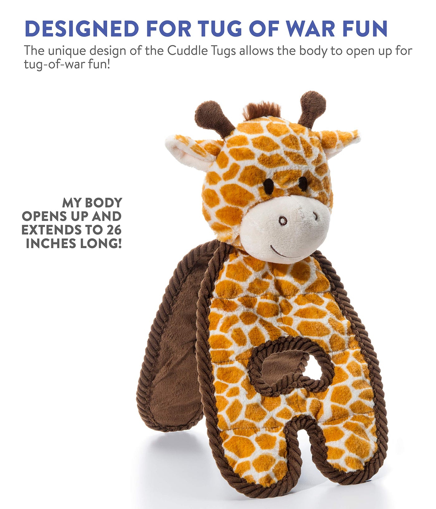 Style:Giraffe Super soft but tough and feisty, our Cuddle Tugs dog toys are dual interactive dog tug toys combined with a cuddly snuggle pal for your pet. Let your dog romp and tug during interactive play time with you. When the game is over, your pet can have a restful snooze with this cuddly plush toy pal. Stuffed with crinkle paper, a squeaker pad, and K9 Tuff Guard for more durability, the interactive soft dog toys are available in four cute characters.