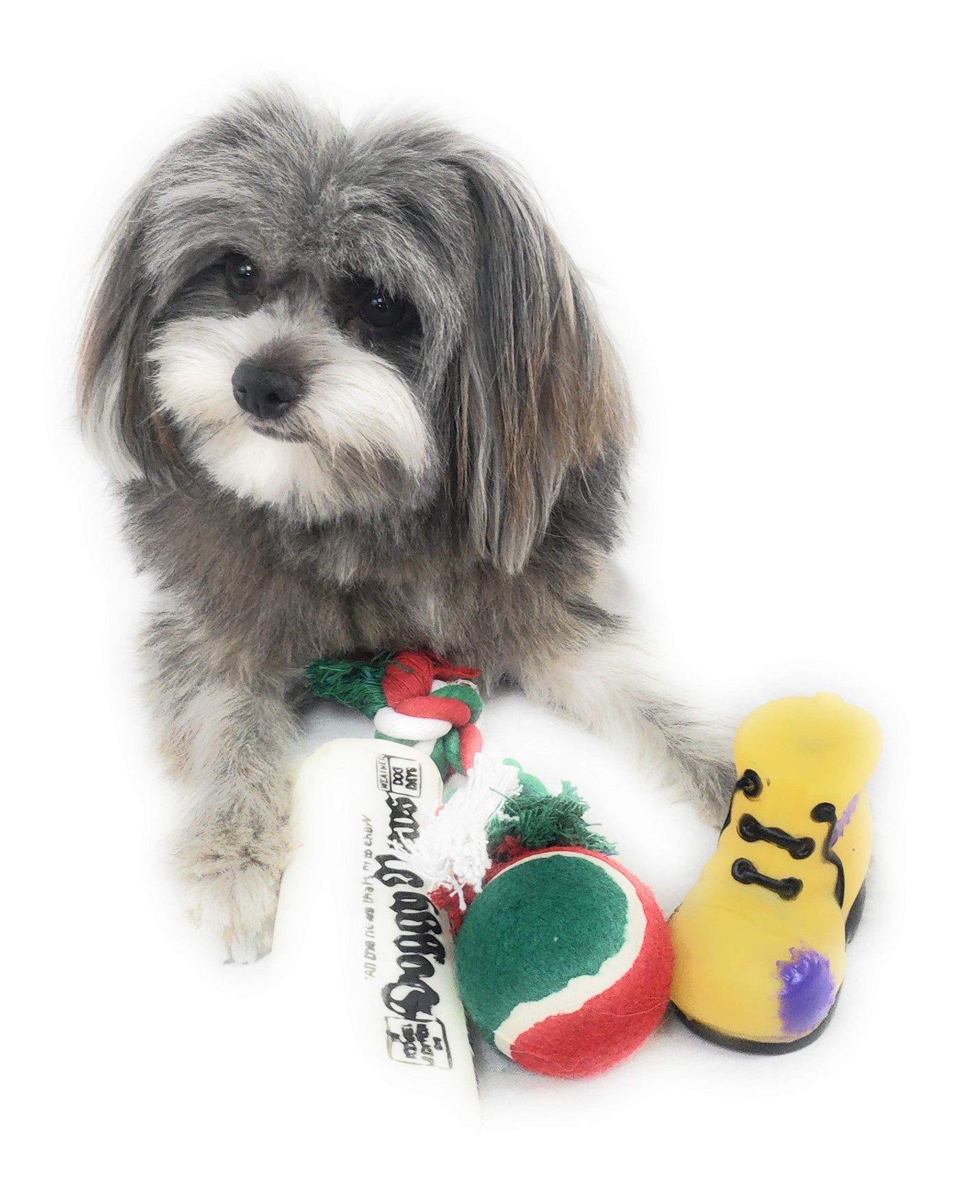 Pets deserve some fun at the holidays too and this Christmas Stocking with Dog Toys makes the perfect gift for furry friends. Set includes a squeaky newspaper toy, squeaky boot toy, a red, green and white tennis ball and a red, white and green cotton knotted rope toy in a transparent plastic stocking with a red and white striped border. Measures approximately 12.5" x 5". Comes packaged in a polybag with a header card.