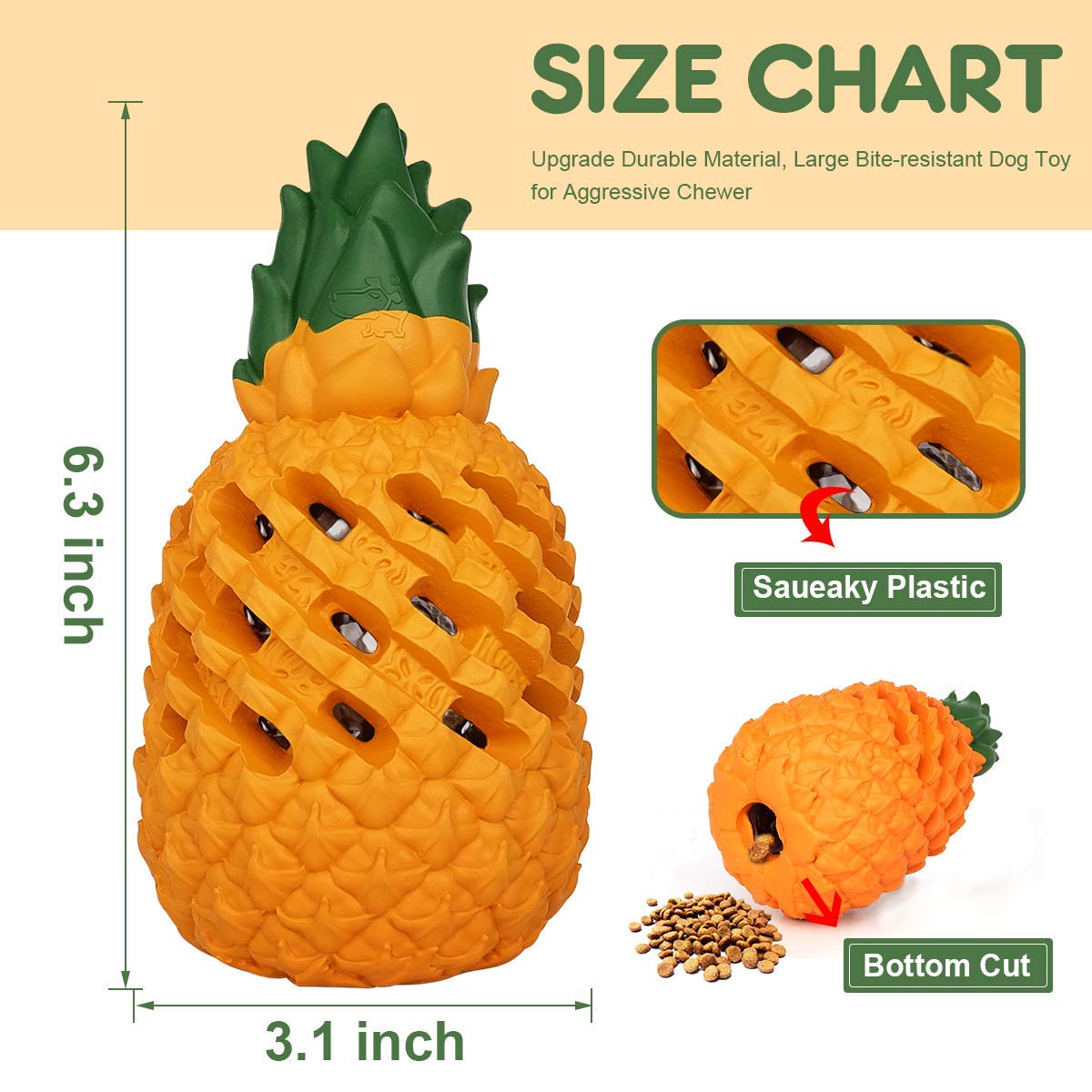 Read more Read more Fairwin Durable Tough Pineapple Dog Toy Gives Your Dog More Fun This strong and tough dog toy is designed for aggressive chewer and can be a training tool. Fairwin offer latest cool designed, interactive training toys for our best furry friends. As a good interactive toy, not only strengthen the relationship between you and your pet, but also train your dogs to improve their various abilities, intelligence, jumping, reaction ability etc. Non-toxic material and tough chew toys for dogs: Made of non-toxic food grade natural rubber to keep the dog safe while chewing and playing. It's bite resistant and tough enough for your dogs grinding and cleaning their teeth.Durable dog toy for Indoor and Outdoor: Stuffing treats or food in it for hours of fun slowly eating and exercise bite force indoor .Play a toss game with your dog outdoors to increase interaction, and it can also train dog’s jumping, reaction ability.Squeaky dog toy for boredom or loneliness: The pineapple appearance, aroma and squeaky sound can can easily attract the dog's attention and make the dog have fun at home without feeling bored or lonely. And you don't have to worry about your dog damaging the furniture. Warm Tips: Please do not let the dog play with this toy in the state of hunger.Please give this toy to the dog after the dog has eaten, which can extend the service life of the product.Pineapple leaves are soft and may be bitten by probability. Don't worry, once the dog eats it, it can be pulled out.Toy must be larger than the width of your dog's mouth, proper supervision is advised when playing with all toys to ensure no accidental swallowing.Do not wash it in dishwashers, just wash with mild detergent and a towel.