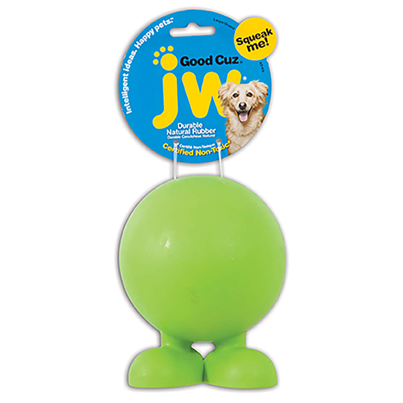 The Good Cuz Large is a part of our iconic top-selling, super squeaky Cuz line of toys. Cuz is a durable natural rubber ball with feet, he will be your dogs new best friend. A resilient ball with a tough squeaker and a formidable bounce this uniquely designed toy is every dogs 1. Great for large and giant breed dogs.