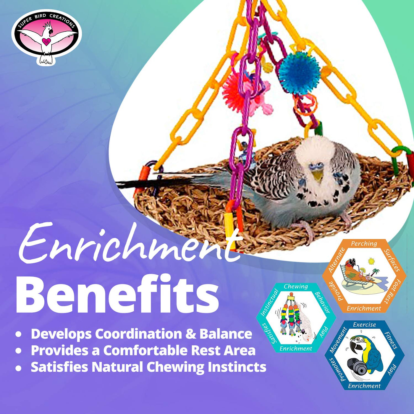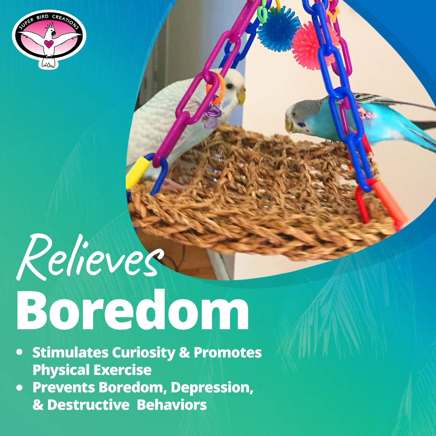 - DESIGN FEATURES This bird toy is crafted with a seagrass mat suspended by colorful plastic chain decorated with fun to explore toy parts. Utilizing a diverse selection of stimulating materials, colors, textures and shapes make Super Bird Creations toys of maximum interest to pet birds.