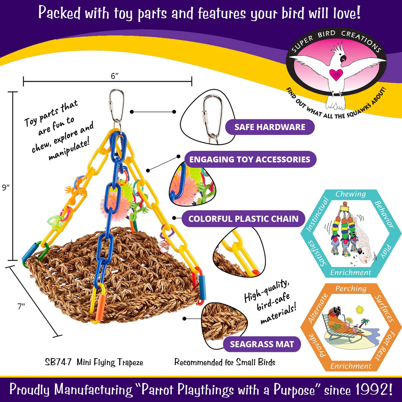 - FOR SMALL BIRDS The Mini Flying Trapeze bird toy by Super Bird Creations is the perfect size for perfect size for Parrotlets, Parakeets, Cockatiels, Lovebirds and similarly sized pet birds.