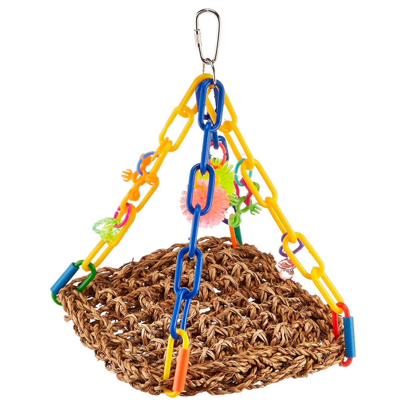 There is no greater fun for a bird than swinging around on a trapeze! Birds love to balance themselves and they enjoy chewing and biting. It is not only instinctive, but a crucial part of their development: they need to play and exercise constantly. Here’s the perfect cage toy for your bird's overall wellbeing and entertainment! Super Bird Creations developed this fun and attractive Mini trapeze toy for small size birds: a comfortable sea grass mat tied to multicolored plastic chains creating the ultimate bird swing. The yellow, Blue, orange, red, Pink, and green array of beads, links, chains, and porcupine balls hanging on the tiny trapeze will instantly catch your bird's attention and invite it to play. This fun toy is designed to provide your pet with both exercise and entertainment. Ideal for parrot lets, parakeets, cockatiels, and lovebirds, this fantastic bird toy for small Parrots is a great cage accessory for your pet. It includes a reliable pear link cage connector, making it simple and easy to hang inside your bird's cage.