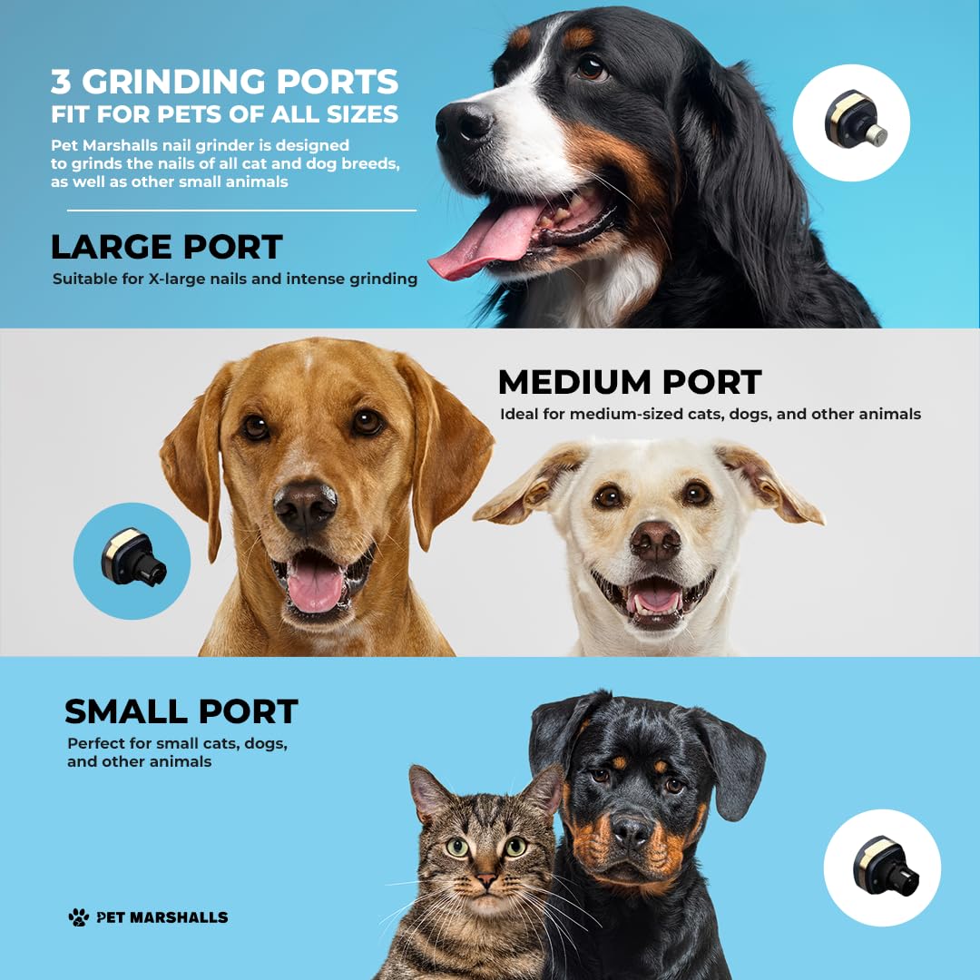 - Adjustable 3-Speed Motor & Multi-Port Design: Features 3 speed modes to handle every nail thicknessfrom tiny kittens to large breed dogs. Includes multiple port sizes to safely grind claws, making it a gentle dog claw trimmer grinder for all ages, including senior or anxious pets.