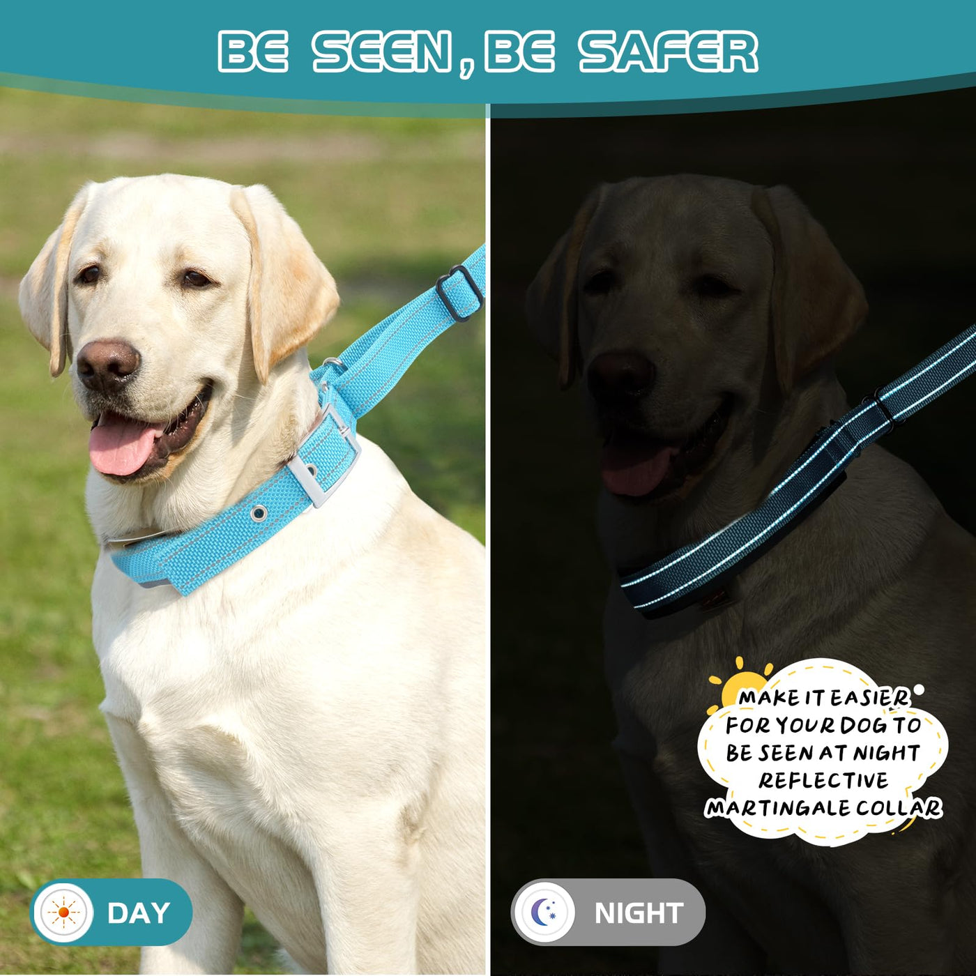 - BE SEEN,BE SAFER:Duckygoo martingale dog collars are reflective and much safer than collars without reflective lines.The glow-in-the-dark reflective line ensures that you and your dog are safely visible at night