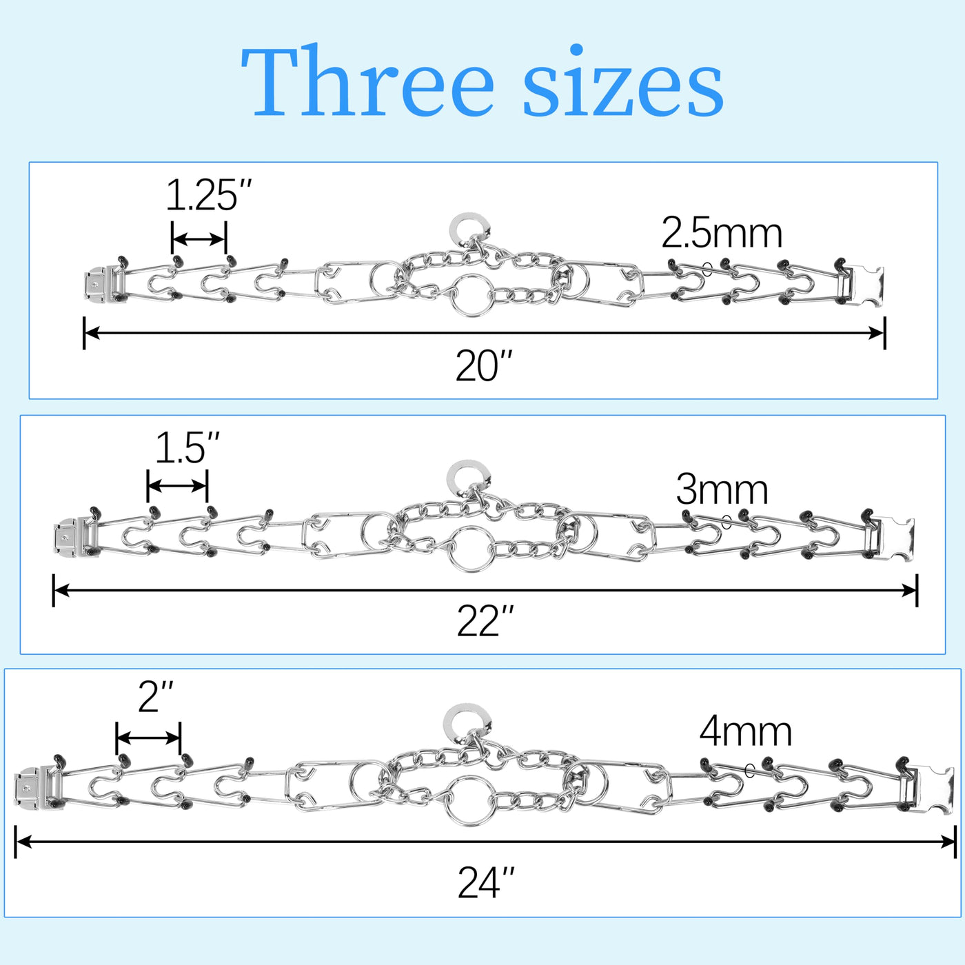 - This Collar is equipped with a rotating ring. The size is 3mm , with 8 links. You can adjust the collar for a comfortable fit by removing or adding links (with 2 additional links). one link is 1.5''