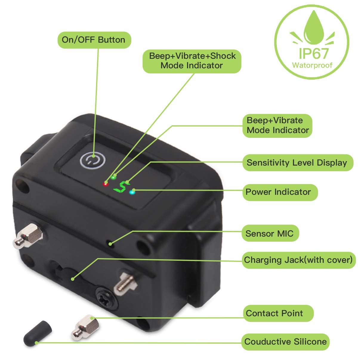 - PARTICULAR TRIGGERING SENSOR FOR NO MORE FALSE TRIGGERING-The triggering sensor equipted in this intelligent bark collar will detect and filter then activates Only when your dog barks(1000-2000kHZ,80-90db).No more other nearby dogs barking,shaking head or other sounds and will activate collar