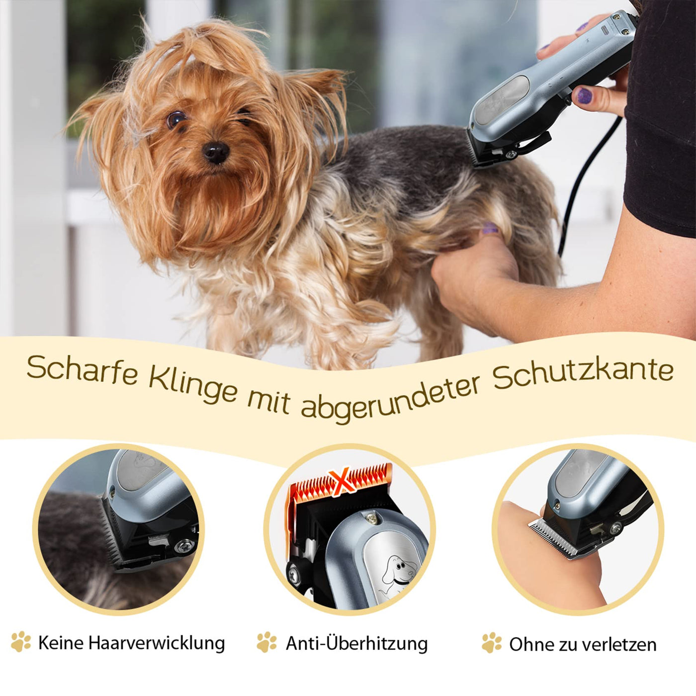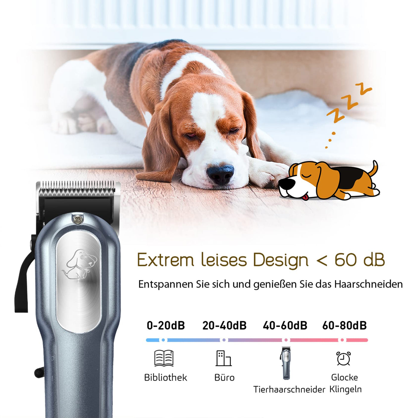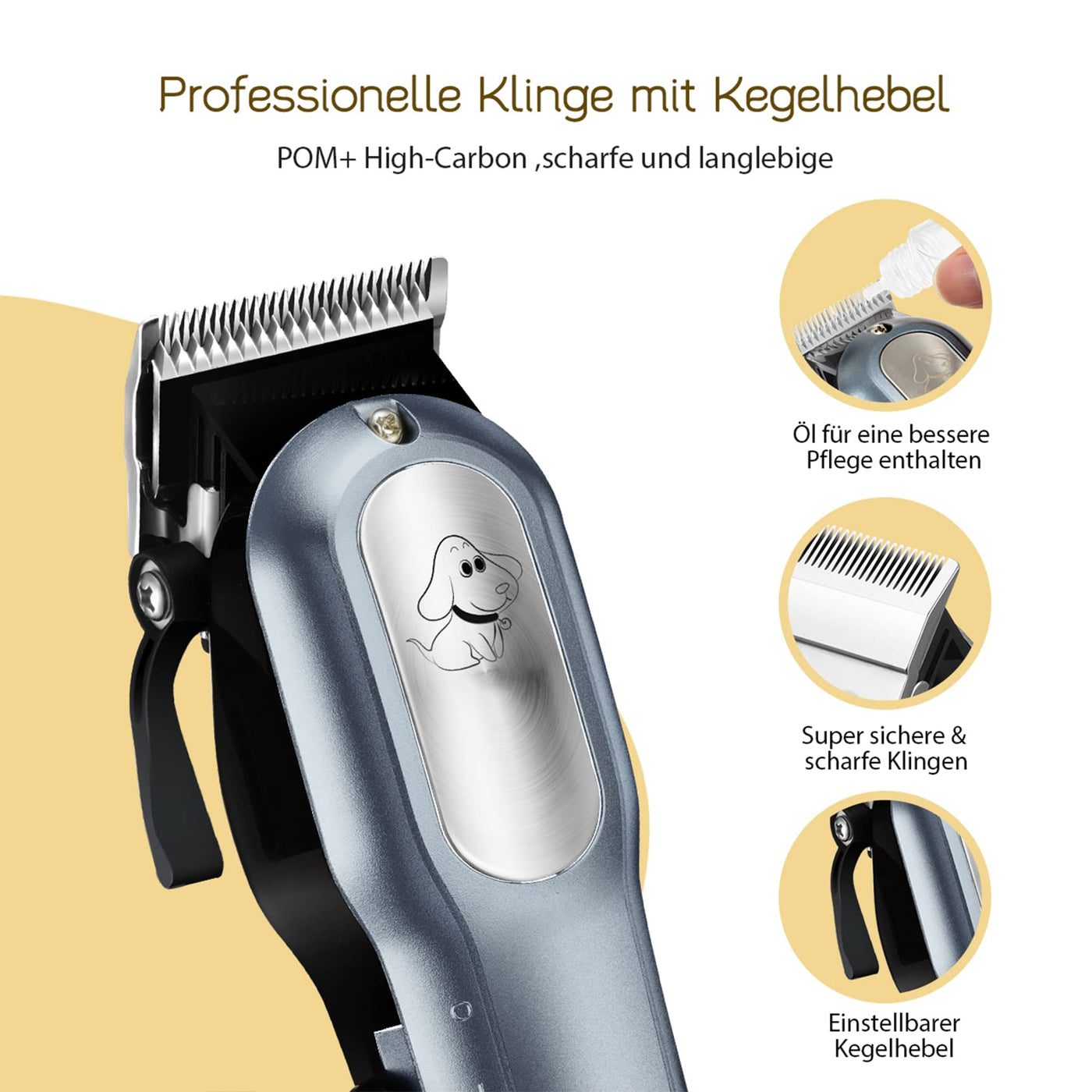- [100% safety, rounded protective edges and low noise work] The edges of the blade are in R-shape rounded to protect your pet from damage. Quiet operation of up to 60dB allows your pet to get rid of boredom and noise and makes cutting your pet's hair easier.