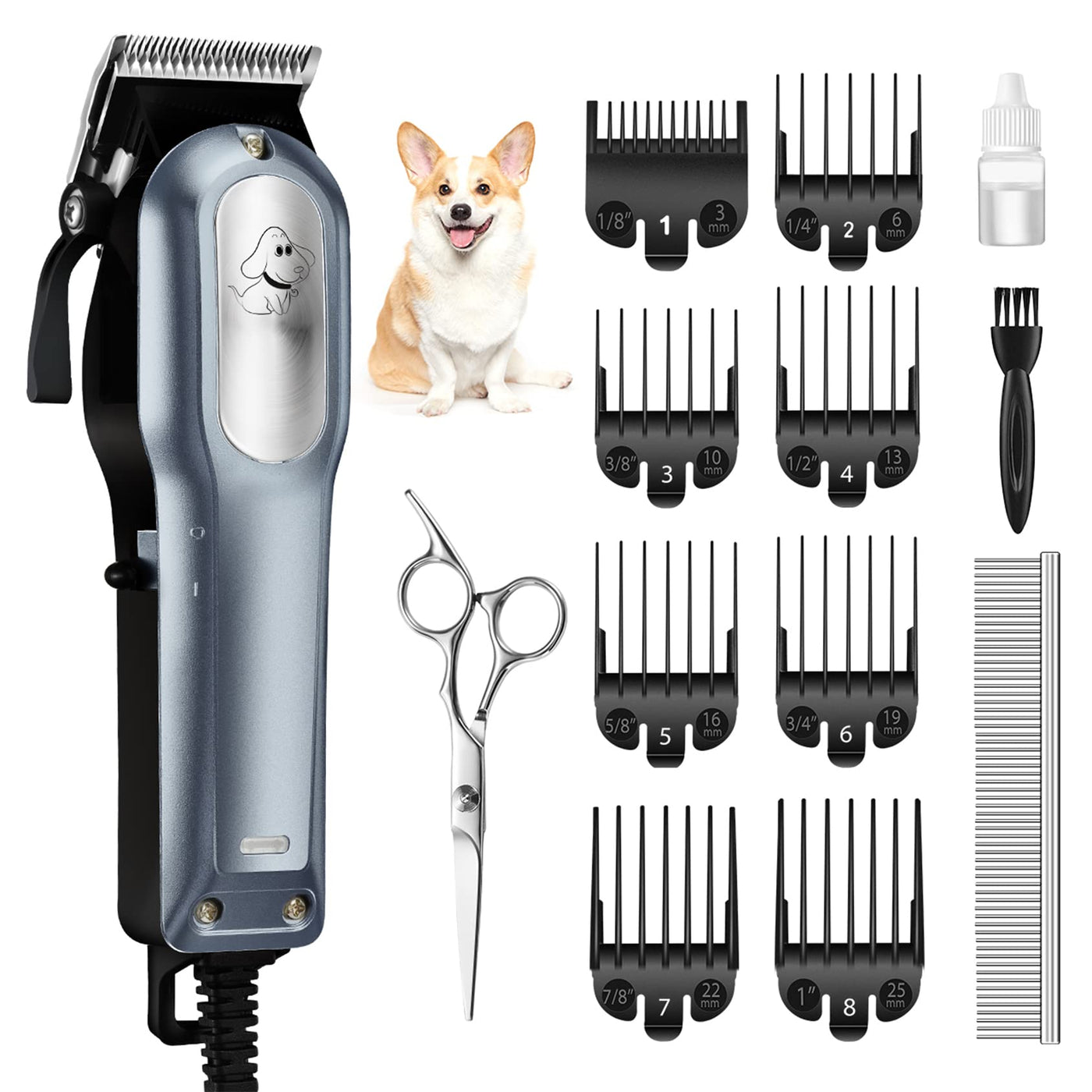 - [8 comb tips 1 scissors] 8 comb tips provide a better experience for your different needs. We recommend that you trim your hair with a large stainless steel comb and scissors before using a pet hair trimmer. It is easy even for beginners.