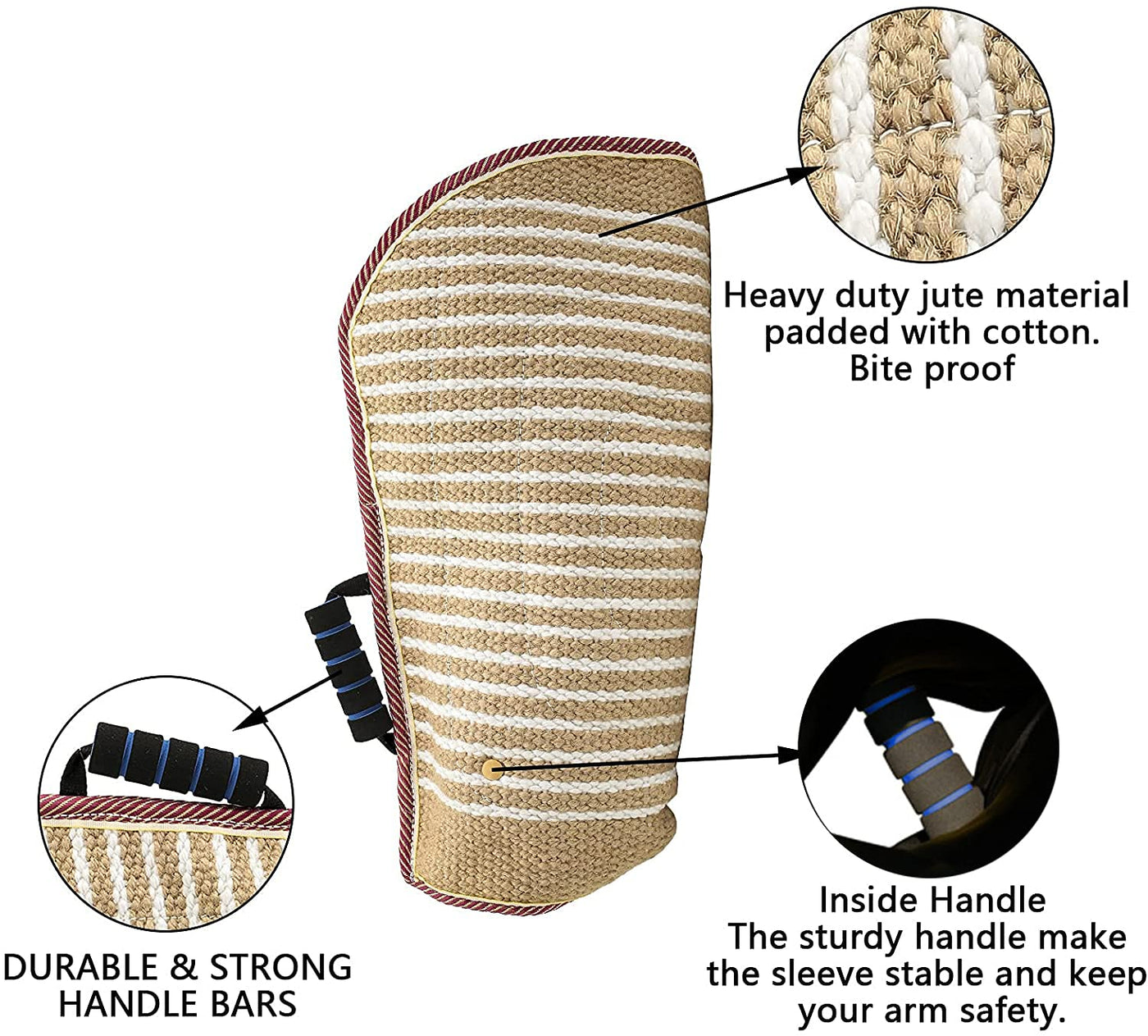 - Material: made of high quality Jute, strong and safety. All used materials are environmentally friendly. The bite sleeve will protect the trainers from the dogs teeth.It can be used both on right and left arms.