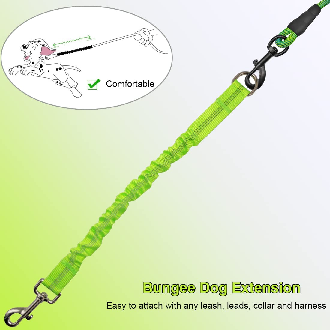 - The bungee leash attachment works well with any dog leashes, collars, harness to absorbs a lot force during dog walking, training or playing thus to reduce the risk of your shoulder and your dogs cervical/neck getting hurt