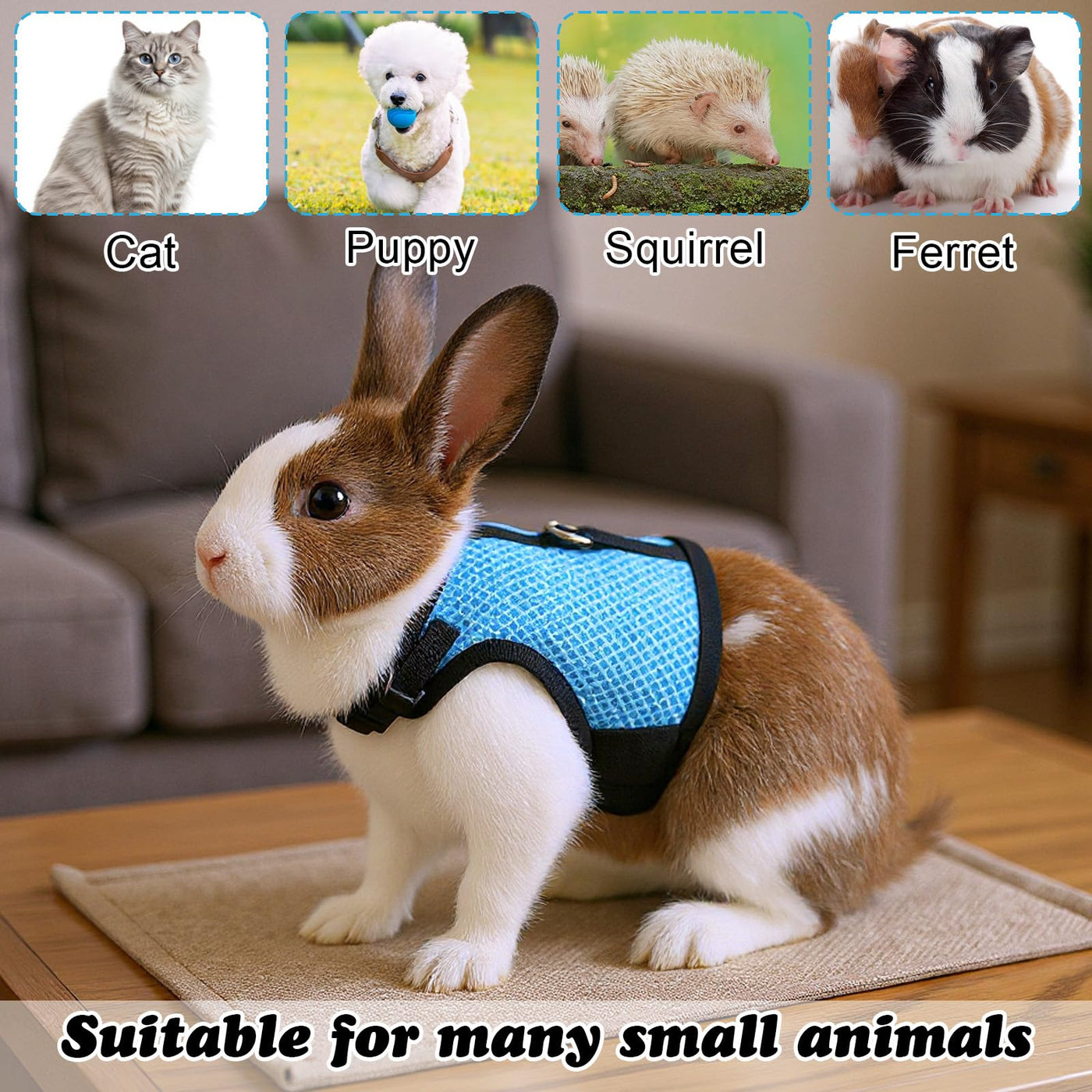 Features:This rabbit harness and leash set features a striking light blue color for enhanced visibility during outdoor activities. The lively pattern adds a touch of playfulness, making it a stylish accessory for your pet. Designed specifically for small animals like rabbits, ferrets, and guinea pigs, this harness ensures they're both secure and stand out.Our rabbit harness and leash set combines practicality and design. Lightweight and portable, it's convenient for outdoor walks and training. More than just a harness, it's a delightful gift that enhances the bonding and love between you and your pet.Product Information:Color: Light BlueMaterial: 100% PolyesterSize L:Neck Circumference: 16-20cm/6.3-7.87inChest Circumference: 20-32cm/7.87-12.6inBack Length: 12.2cm/4.8inPackage Included:1 Rabbit Harness and Leash Set (Size L, Light Blue) Note:1. Please check if it is the size you need before purchasing.2. Please allow slight differences due to manual measurement.3. Due to light and screen difference, the item color may be slightly different from the pictures. Please understand.