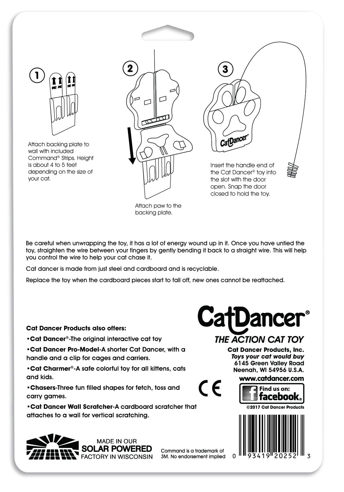 Size:Original The Cat Dancer Deluxe is our Original Cat Dancer handheld toy packaged with a plastic paw that is to be attached to a wall to hold the toy for cats to play alone. It is attached to the wall using command strips which we include in the package. It takes just 30 seconds to install and its literally a snap to attach the toy for the cats to play.