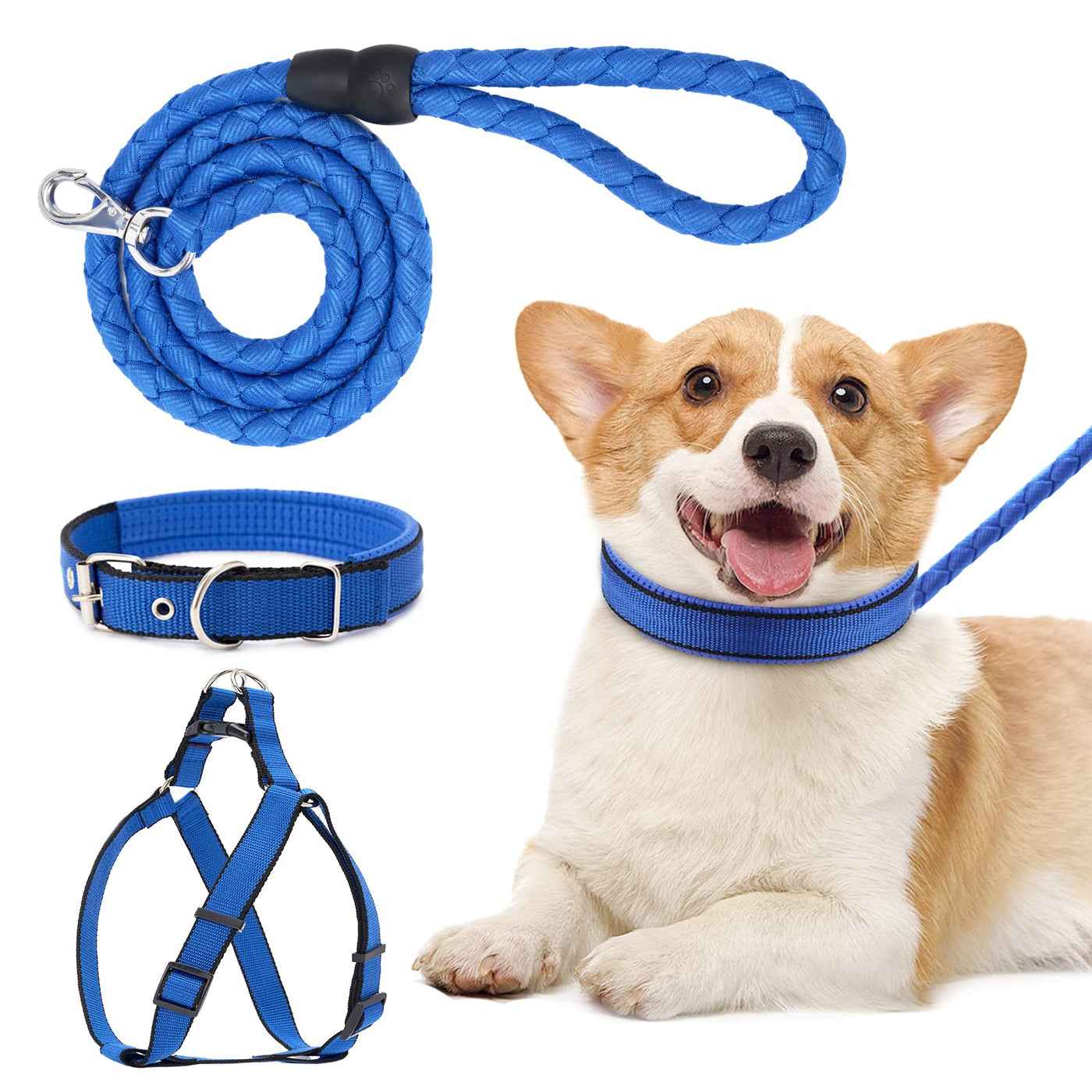 - SAFETY DURABLE MATERIAL - Made of high-quality polyester, no harm to pet's neck, soft and comfortable. An easy-to-clean leash that's flexible, but tangle resistant. This set of dog's safety harness, leash and collar must be strong enough to easily control your naughty dog, which is your best choice.