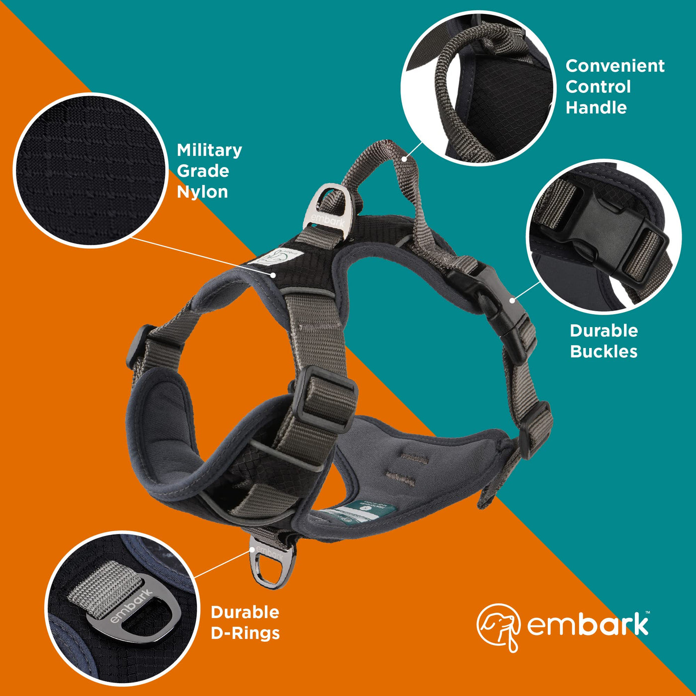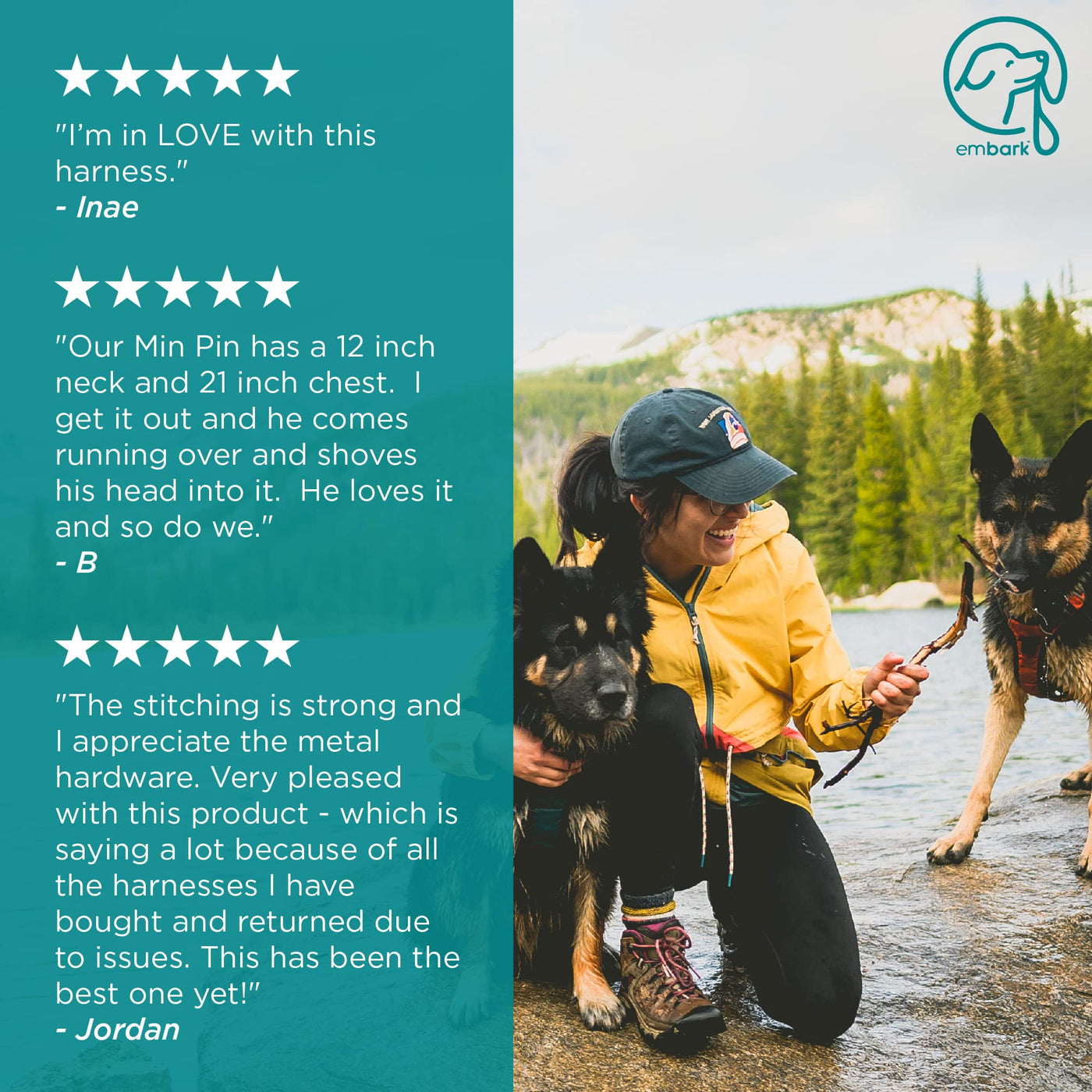 Read more Testimonials Had this harness for six months now and still going strong on my very powerful 4 year old german shepherd , very well thought out with the handle and underneath clip i find these come in very useful when i need help to restrain him in tight spaces with passing cars and tricky situations , I would highly recommend this harness it fits him well with the proper adjustments and looks very smart i even hang his poo bag dispenser on it saves me carrying them. - Paul C - Amazon Reviews Read more Built for Adventures Made from our toughest Rip Stop Nylon and reinforced throughout, the Adventure Harness is built to last. It is padded and soft where it needs to be because the last thing we want is something like chafing stopping you from your adventures. Read more Front and Back Lead Attachment Our Adventure Harness comes with a front and back lead attachment, so you can decide how to stay connected with your pup Protect Your Dog's Trachea & No Pull Training Our harness design prevents damage to your dog's trachea and the front lead attachment deters your dog from pulling Control Handle When Needed Each harness comes with a control handle on the back, so you can keep your pup close when needed Easy On and Off Our easy to adjust straps and buckle mean that you only have to adjust it once at the start. Then next time you want to head out with your pup, just pop it over your pup's head and snap the buckles together and you are ready! Read more Embark On The Adventure We believe in making high quality, long-lasting dog gear, which is above and beyond the standard quality in today's market. We only make gear that allows you and your best friend to Embark on any adventure together Read more Taking Care of Our Community We built Embark to help do some good in this world. We do that by giving back to our community, and being conscious of our environmental impact. With your help, we have been able to donate thousands of new and lightly used harnesses, leads, collars to animal charities such as the RSPCA and Battersea Cats and Dogs every year. Hello, We are Embark Pets Life was meant for great friends and even better adventures. At Embark, we help make that happen. In 2015, Embark Pets was founded by 5 friends (3 humans and 2 dogs) who a shared passion for simply doing fun things together and a love for the outdoors. We set out to create our own high quality, well designed gear and to share with you! We are based in South Carolina, USA and London, UK. Rigorously Tested, Dependable Gear - We go above and beyond national standards of pulling strength Customer Focused - We always want you to be happy and work with you, through any questions or problems Read more