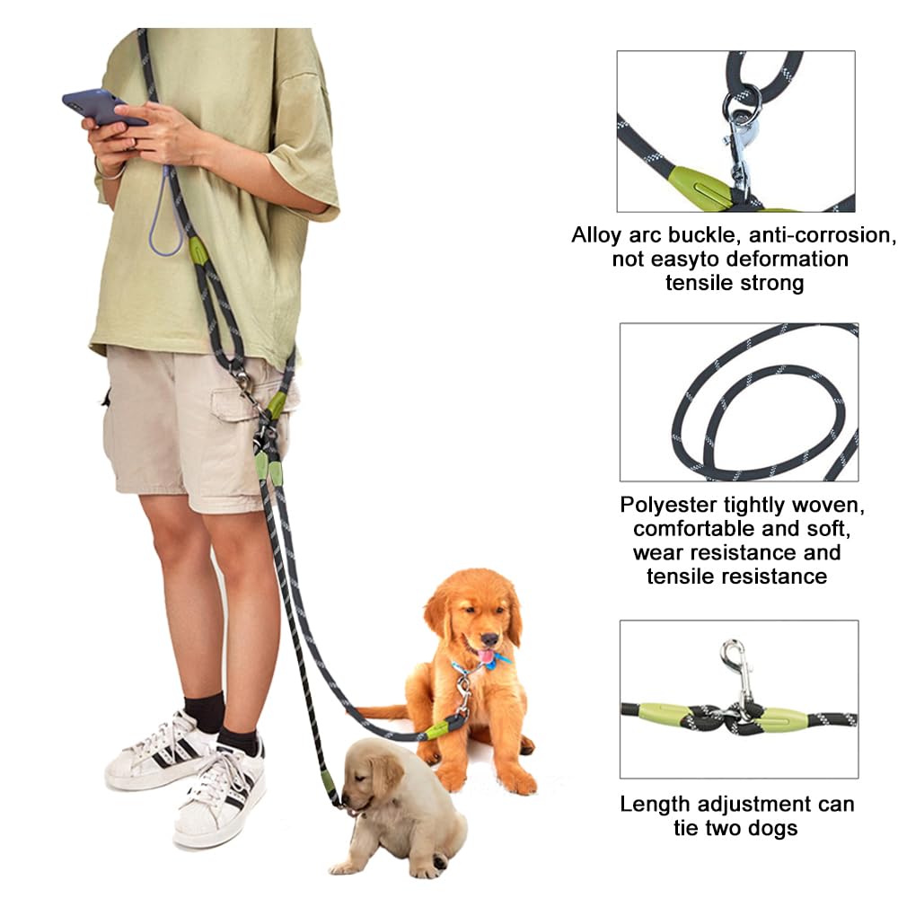 Hands-free Dog Leash for 2 Dogs, Crossbody Double Leash for Running, Walking, Training, Nylon, Reflective, Heavy Duty Dog Leash, Belt for Large, Medium and Small Dogs