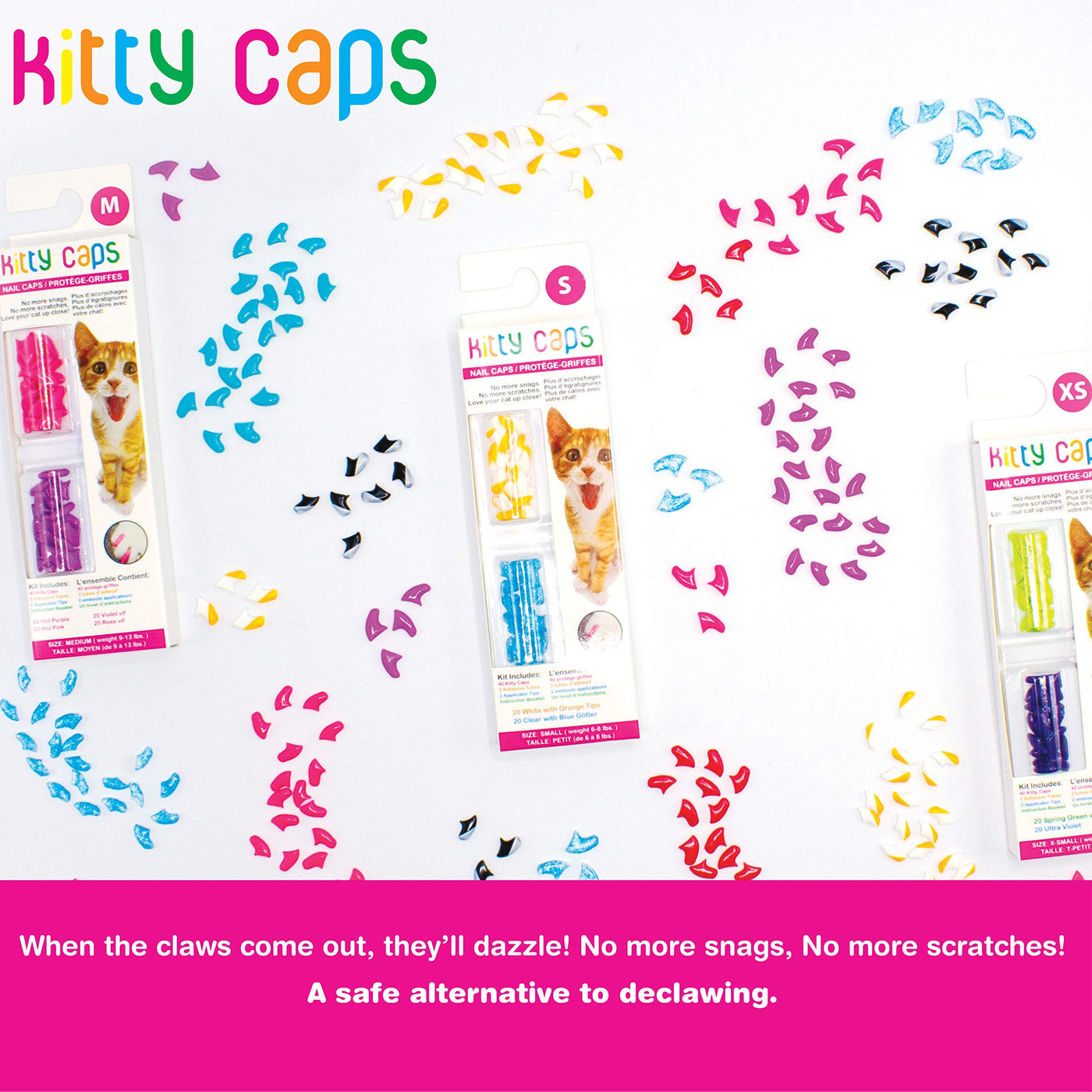 Keep your furniture protected from cat claws with these colorful cat nail covers. Kitty Caps for Cats provide a safe and humane alternative to surgical declawing and help prevent damage to furniture caused by your pet's natural desire to scratch. Kitty Caps are made from a safe and nontoxic natural vinyl resin. They're safe, easy to apply, and stop all snags and scratches. After application, your pet's claws can extend and retract without any disturbance. Kitty Caps will fall off as your cats nails grow and shed, generally 4-8 weeks after application. Package Contents: Each pack includes 40 Kitty Caps, 2 Adhesive Tubes, and 2 Application Tips. Sizing Guide: X-Small (XS): Cats under 5 lbs. Small (S): Cats 6-8 lbs. Medium (M): Cats 9-13 lbs. Large (L): Cats over 13 lbs. Application Instructions: STEP 1: Trim the tip of your cat's nails. Trim just enough to allow the nail cap to fit all the way to the base of the nail. STEP 2: Fill nail caps 1/3 full with adhesive. Gently squeeze the nail cap to evenly distribute the glue and release any air bubbles. If the glue oozes out of the nail cap, you have inserted too much adhesive. Remove some of the glue by squeezing it onto a paper towel. STEP 3: Extend nails by gently pressing thumb on top with index finger on bottom of paw -- slide nail caps onto nail. STEP 4: Observe cat for five minutes before release. You can play with your cat or feed some of kitty's favorite food to distract for a few minutes. YOUR SATISFACTION IS OUR PRIORITY: If you have any questions or feedback, please please reach out to us at Fetch for Pets.