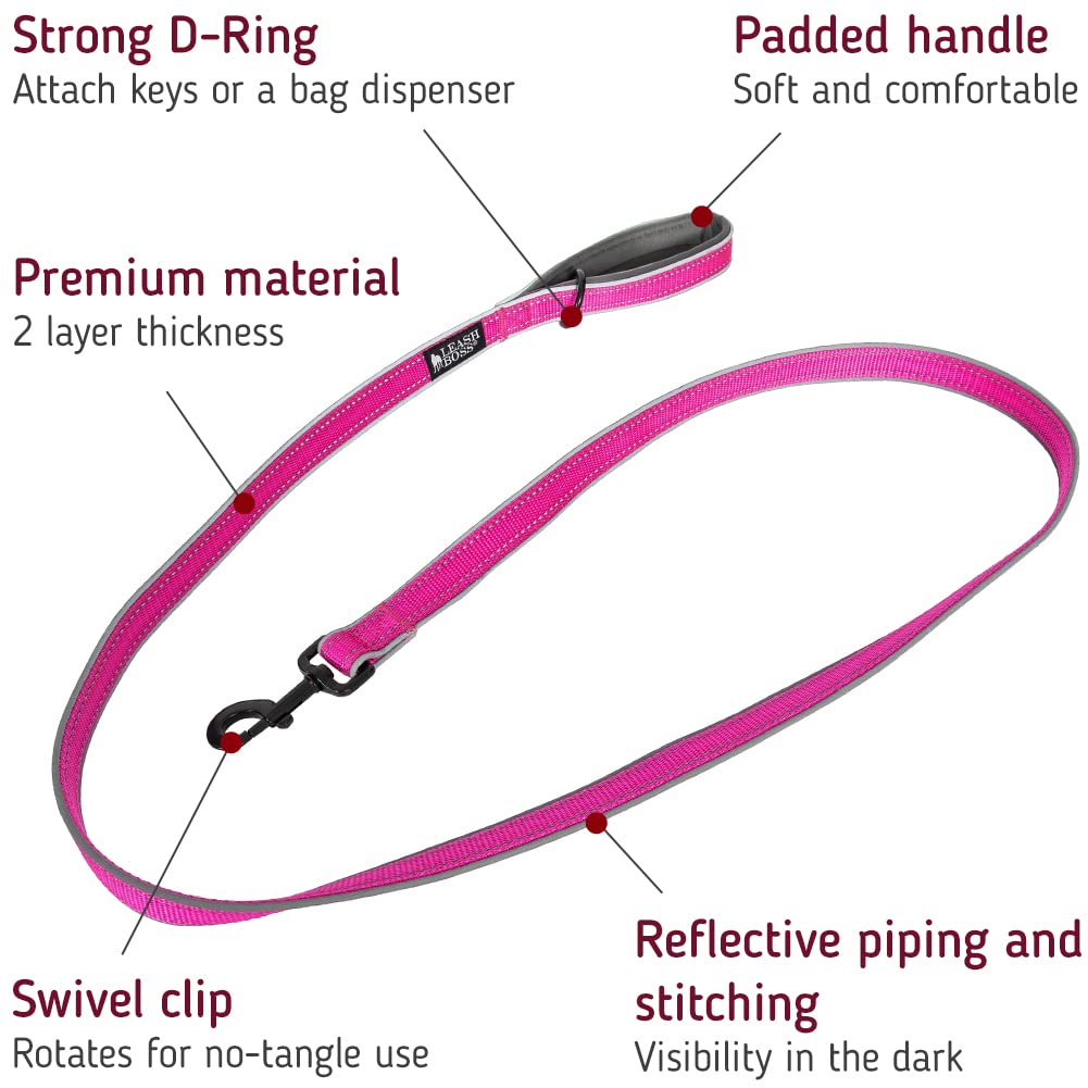 Leash Boss 6ft Double-Thick Soft Padded Handle Reflective Leash for Large, Medium Dogs & Puppies 6 Ft x 1" Wide Pink