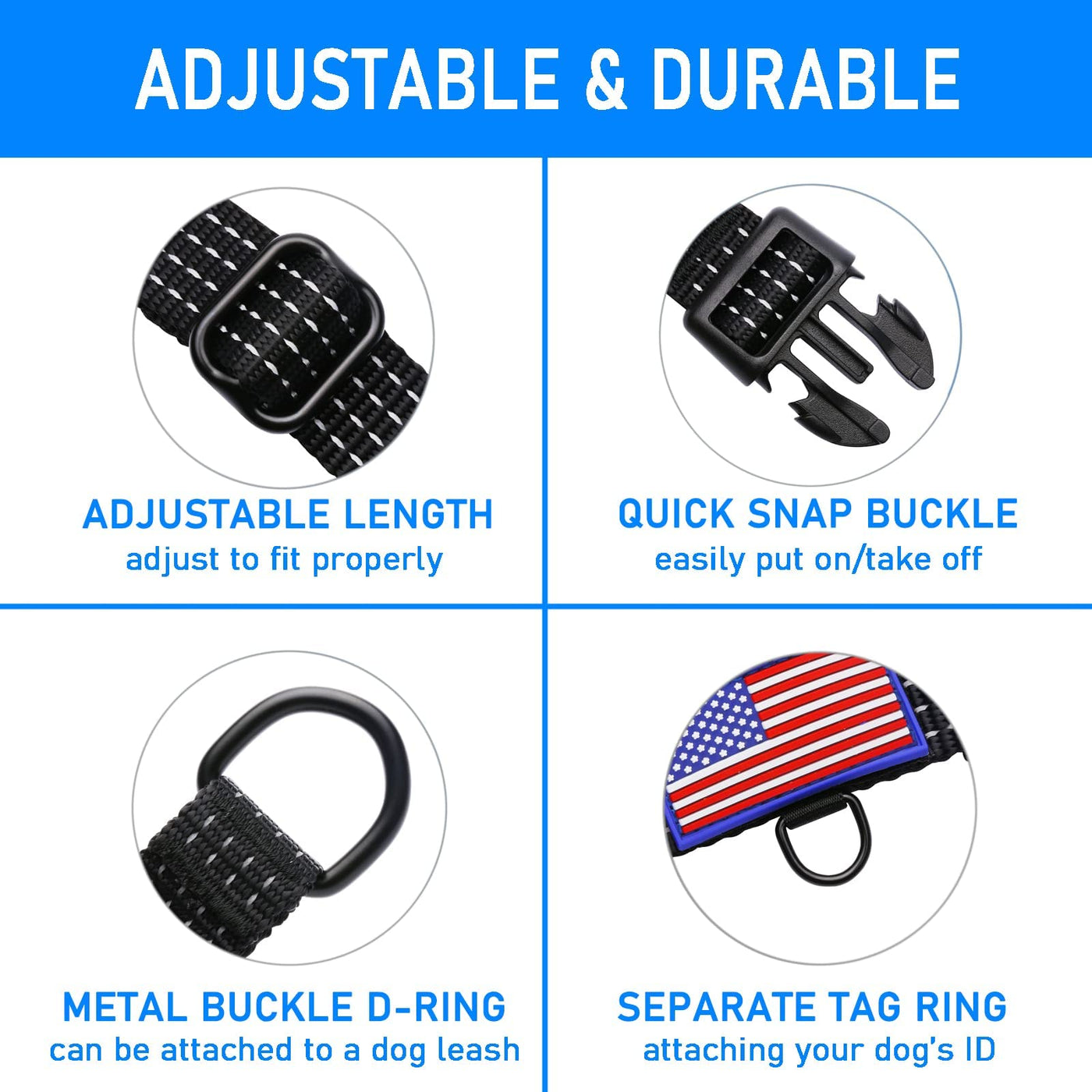 - 4.[REFLECTIVE & AMERICAN FLAG] Including a US American Flag national emblem. Make the collar special, it is a perfect gift for dog lovers. 4 Highly reflective piping making the collar glow in the dark. So you will be seen from distance and walking in the dark would be safer. Personalize your pup with 5 colors, red, purple, black, blue, pink.