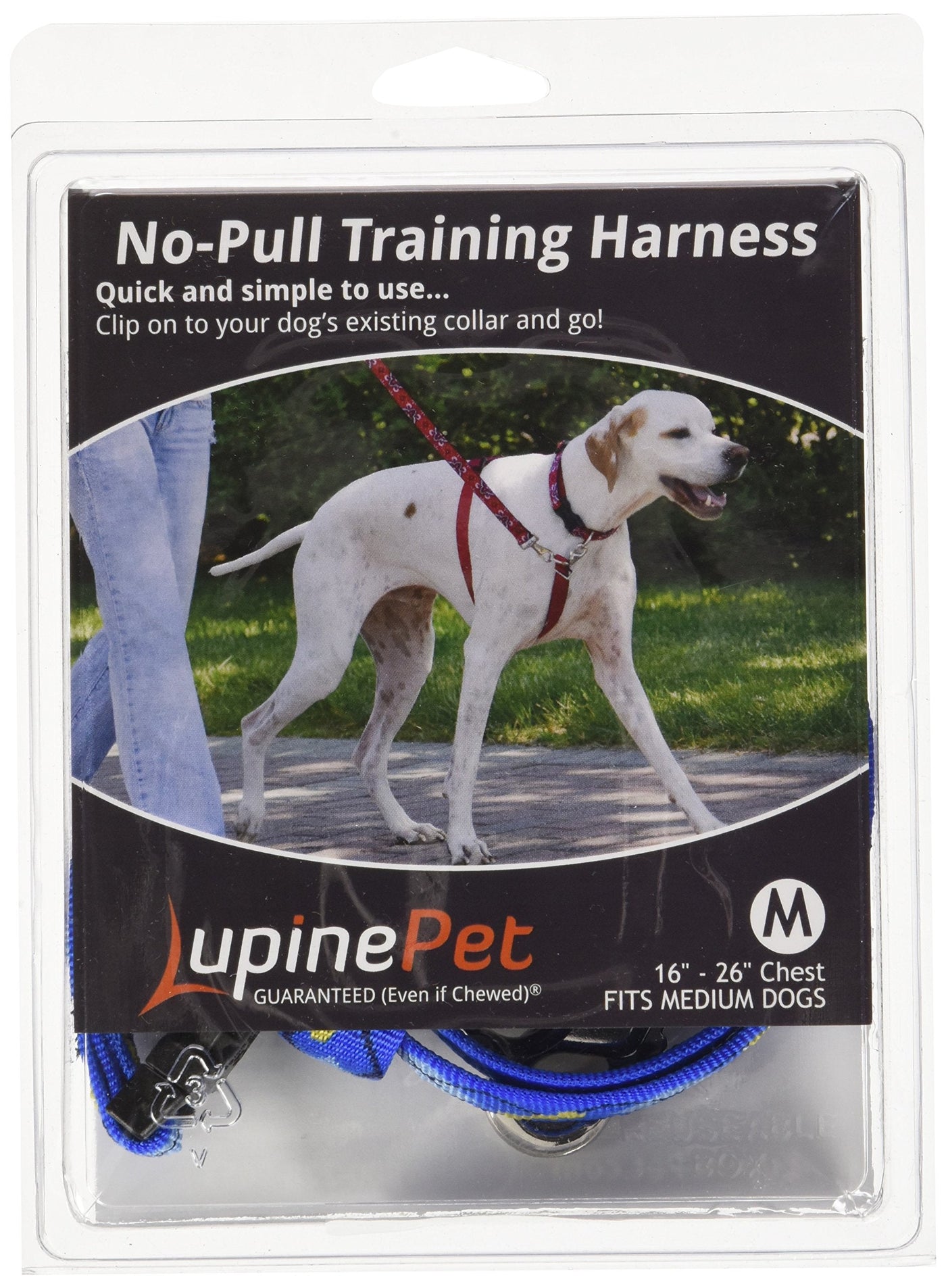 The Lupine No Pull harness is a simple and effective tool, that with training helps teach your dog polite leash-walking behavior. The No Pull harness does not keep the dog from pulling. It helps you convey that pulling is much less rewarding than not pulling. You should see some improvement pretty quickly. The time it takes to change a behavior greatly depends on how consistent you are. Well-exercised dogs learn faster than dogs with too much pent-up energy, but all dogs can learn to walk politely. Harness works with any non-choker style collar. The No Pull Harness is available in ¾ inch and 1 inch widths and a variety of Lupine colors and patterns. Matching Lupine collars and lead available. How to use: Using a pull-and-RELEASE action, your pull turns the dog from the direction he's going towards you. As he is redirected, release the pull so the lead is slack, then use vocal praise or a treat when the dog looks at you with slack in the lead. Be consistent in the redirect and use lots of praise. We have found that this tool works best with a 2 or 4 lead.