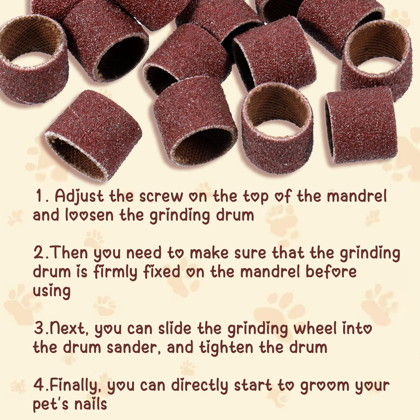 - Effortless Use:Our dog nail grinder replacement heads are designed for quick and easy installation, you can adjust the screw on the top of the spindle to removal and fix the grinding drum. And the paws replacement heads allow you to switch between different grit levels effortlessly, you just need to slide the sanding bands into the drum sander according to the grit you need and tighten the drum.