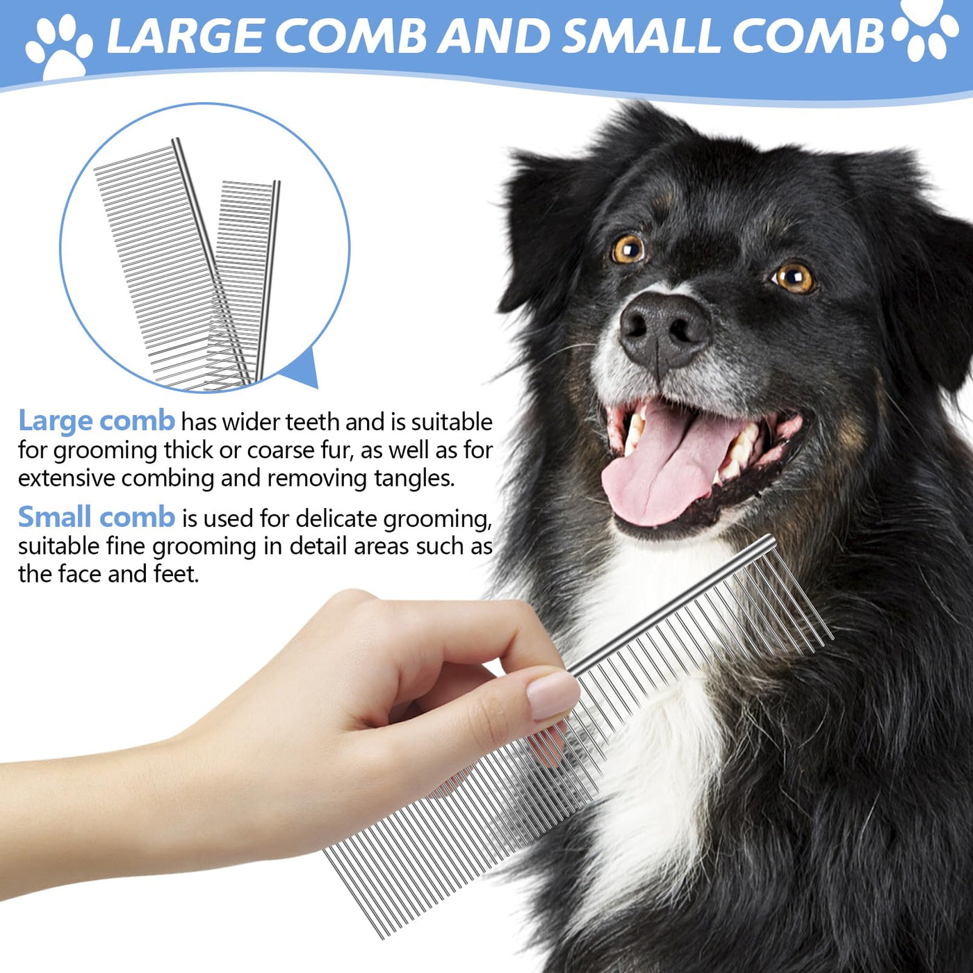 - Professional Kit: Large scissors are usually used for general body trimming, straight cutting, and neat shaping. Small scissors are suitable for narrow areas, and delicate trimming of sensitive areas, such as around the feet, legs, and eyes. Large comb has wider teeth and is suitable for grooming thick or coarse fur, as well as for extensive combing and removing tangles. Small comb is used for delicate grooming, suitable fine grooming in detail areas such as the face and feet.