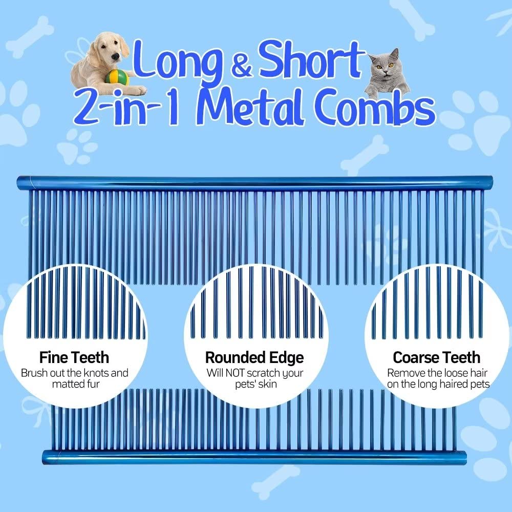 - Pet Grooming Combs Kit - Our pet grooming comb kit includes 5 different kinds of pet combs: tear stain remover comb x 1, long 2-in-1 metal comb x 1, short 2-in-1 metal comb x 1, blue short teeth comb x 1 and blue grip comb x 1 to meet different needs. Perfect for straightening out the knotted tangles hair, as well as finishing and fluffing.