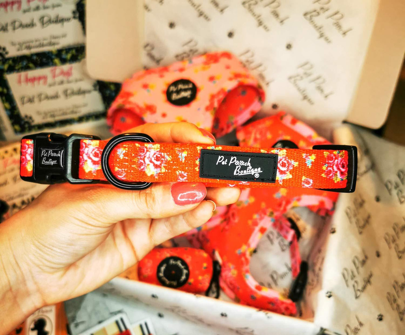 Red Vintage Collar A vintage classic floral print in shades of cherry red Fully adjustable Padded for extra comfort Branded rubber logo badge Designed in the UK Black metal hardware d ring and branded black plastic clip buckle fastening. Collars and harnesses to match Size Guide: Small 28-44cm/ 11-17 inch. 1.5cm wide Medium 32-50cm/ 12.5-19.5 inch. 2cm wide Large 41-66cm/ 16-26 inch. 2.5cm wide always check your dogs accessories for wear and tear - no product is indestructible Hand wash only and lay flat to dry Box Contains 1x dog collar