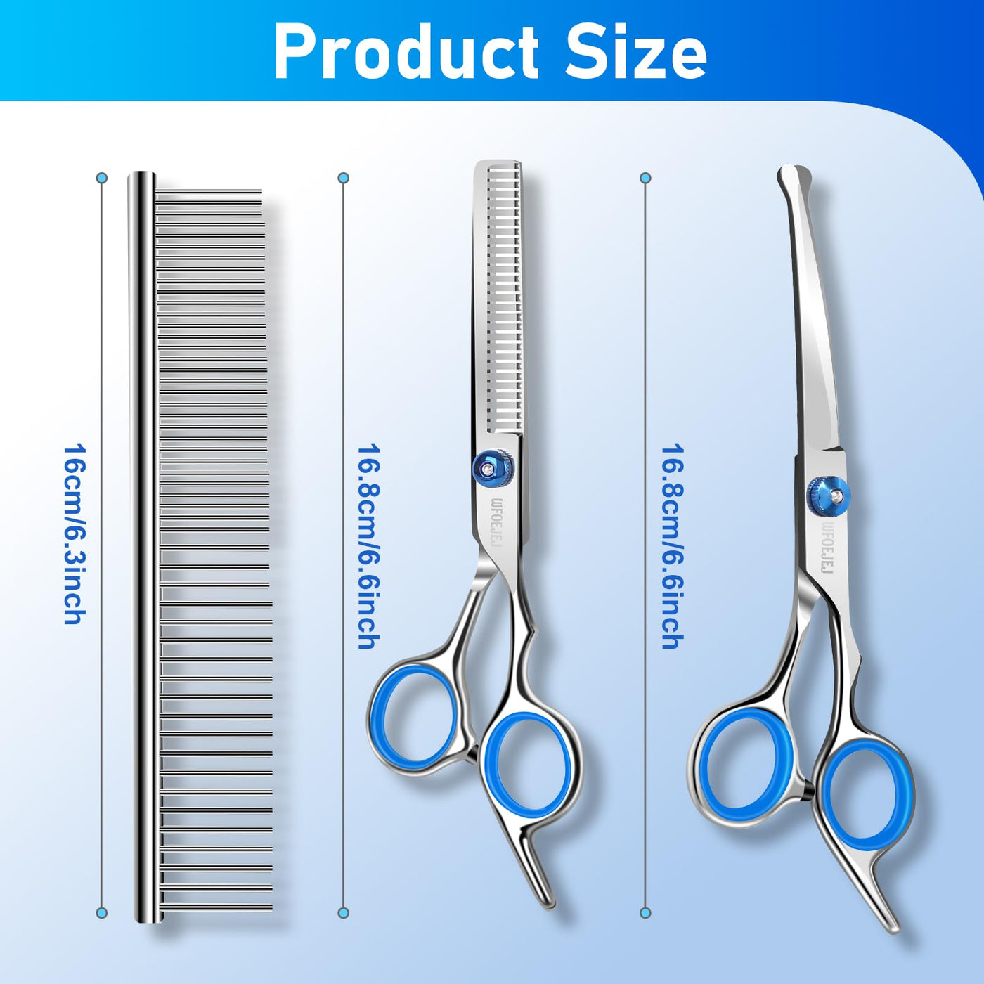 - Complete 3 in 1 Dog Grooming Scissors Kit: Includes 6.5-inch thinning shears, 6.5-inch curved scissors, grooming comb, and a durable storage caseperfect for both home use and professional groomers.