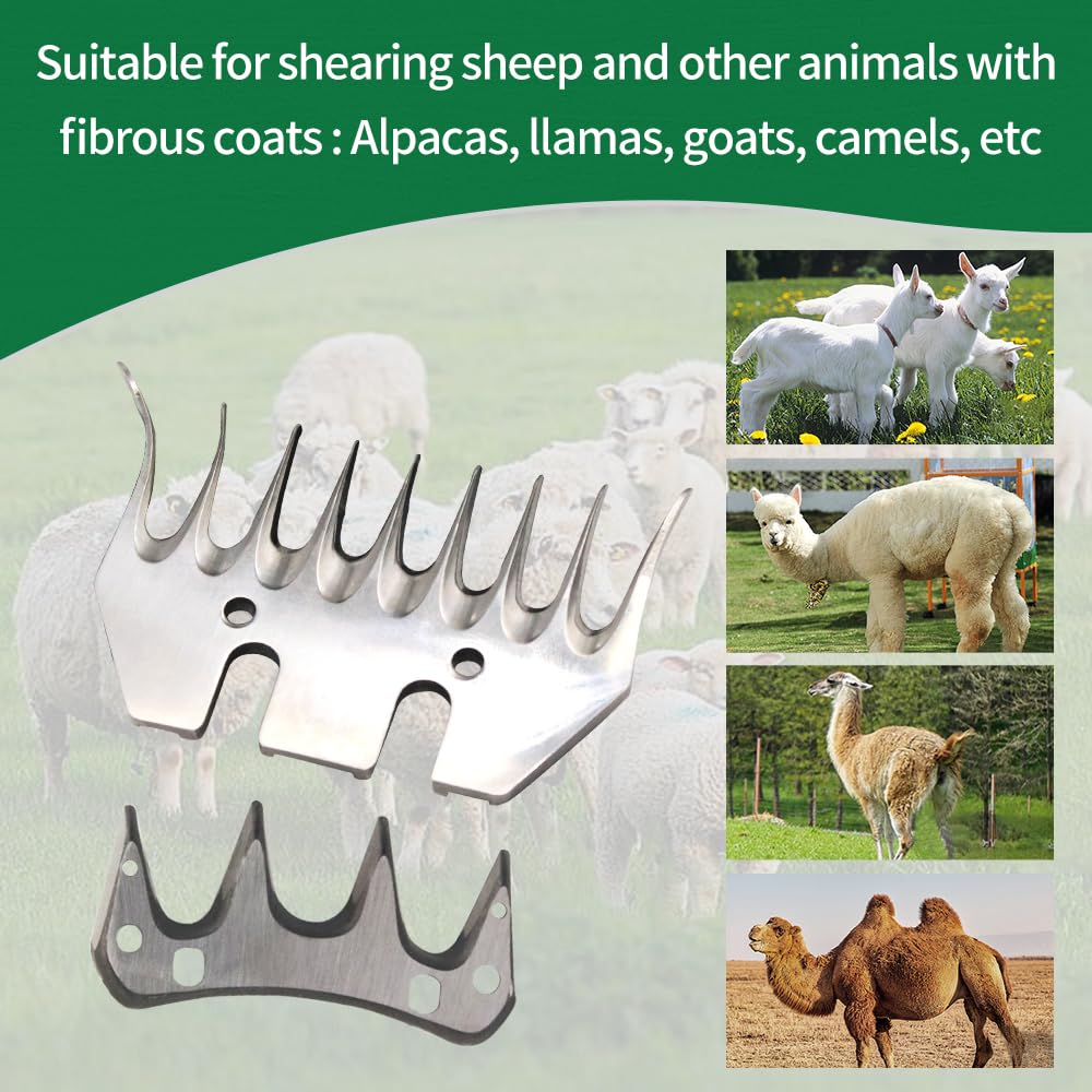 Sheep Shears Blades Curved 9-Tooth Wool Shearing Comb and Cutter Blade Set for sheep goats llamas alpacas and other members of the camel family. Specifications: Name: Curved 9-Tooth Wool Shearing Comb and Cutter Blade Set Materials: Stainless steel Color: sliver Size: Wool Shearing Comb:L:8cm/3.15inch;W:6.5cm/2.6inch Cutter Blade:L:6cm/2.36inch; W:3cm/1.18inch Package included: One curved 9-tooth comb blade One 4-tooth replacement cutter Introduction: The blades is for electric sheep shearing machines, you can compare it with your sheep shearing machine, if the parameter is similar with your blades, then it can be okay for your machine. of course,every machines have its tolerance for its blades' size.