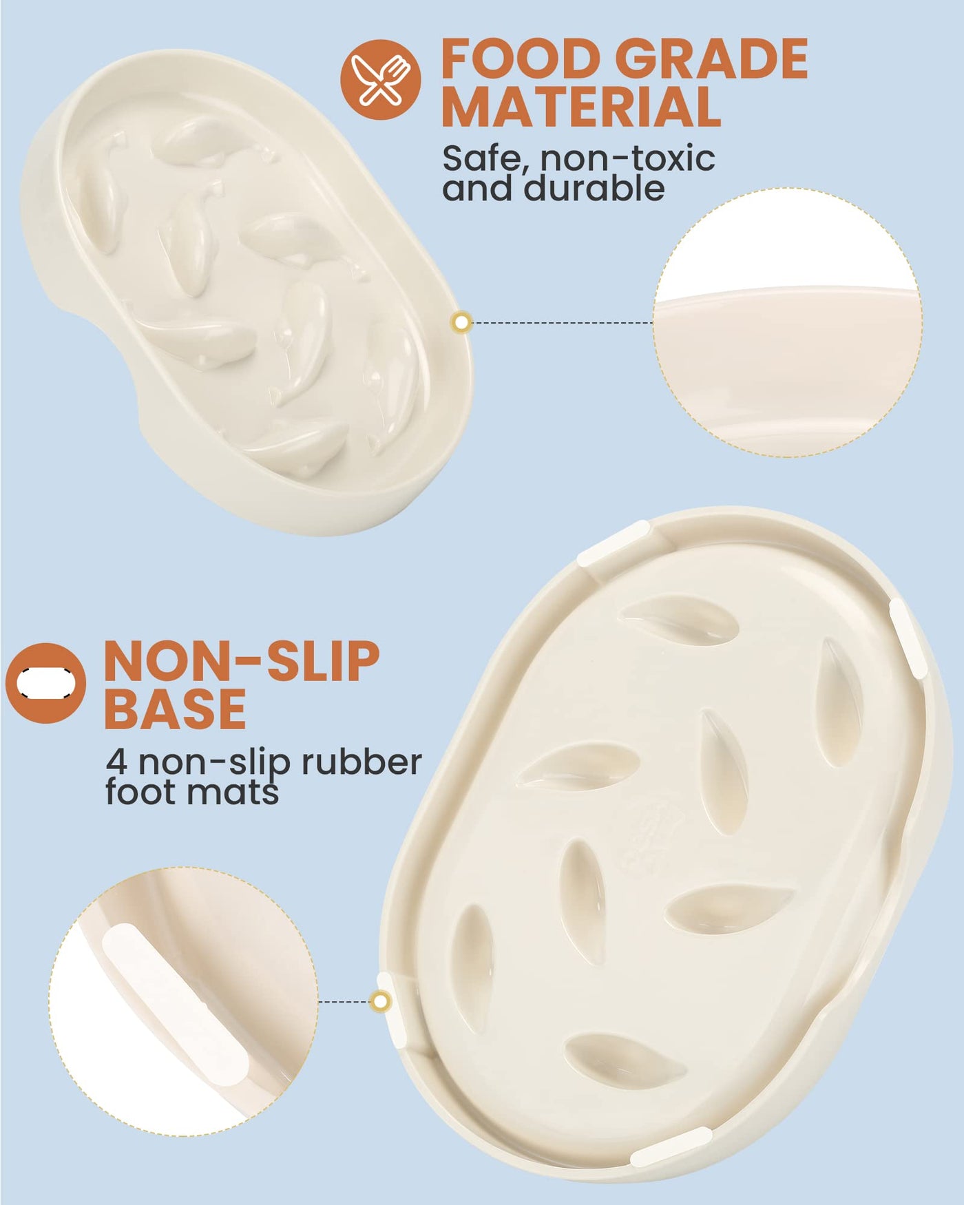 - Anti-slip BowlThe slow cat feeder features 4 rubber feet that increase friction and stability, preventing your furry friend from sliding it around while eating and damaging the floor. This ensures maximum stable and safety for mealtime