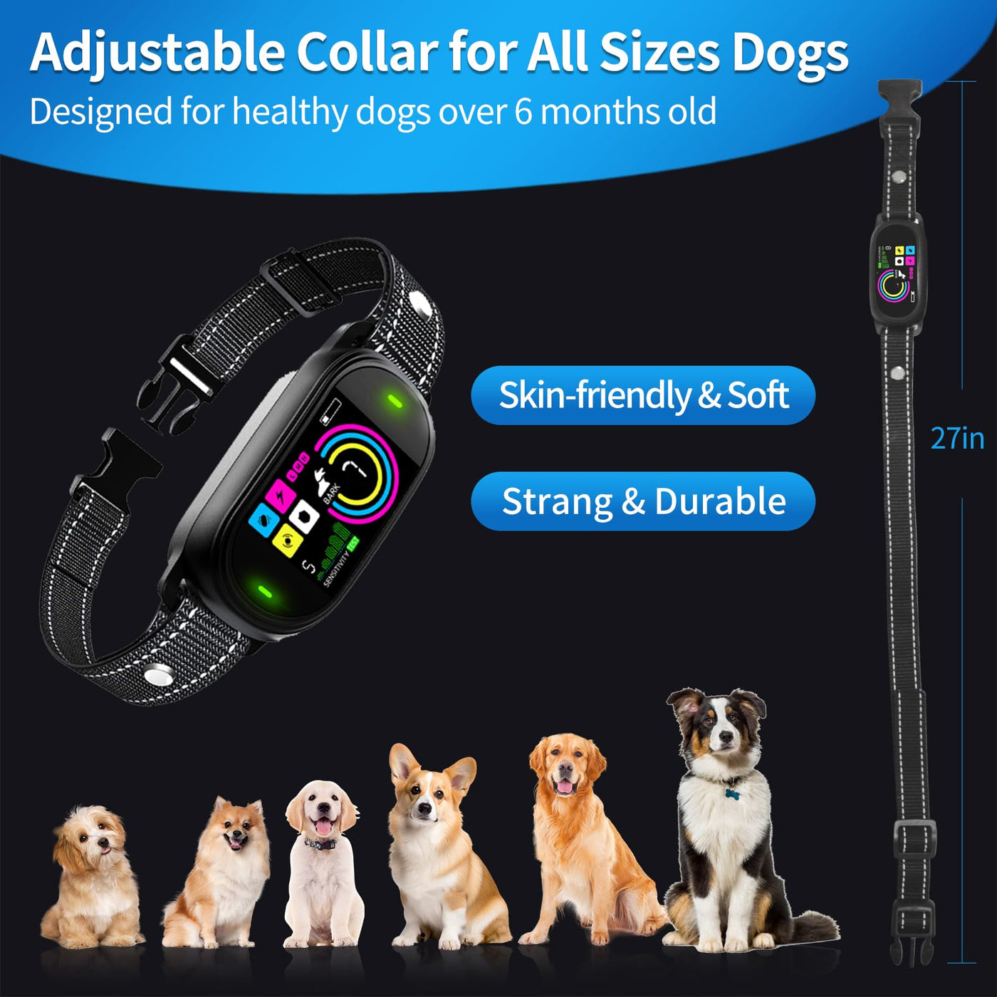 - Designed for healthy dogs over 6 months old: No Barking collar measures 27 inches. This small dog bark collar strap, made of skin-friendly and comfortable soft nylon, fits dogs over 5-120lbs with neck sizes 6-27 inches. dog bark collars for large dog, medium dogs,small breed dogs. The main number on the screen can display and count the number of consecutive triggers of this no backing collars.