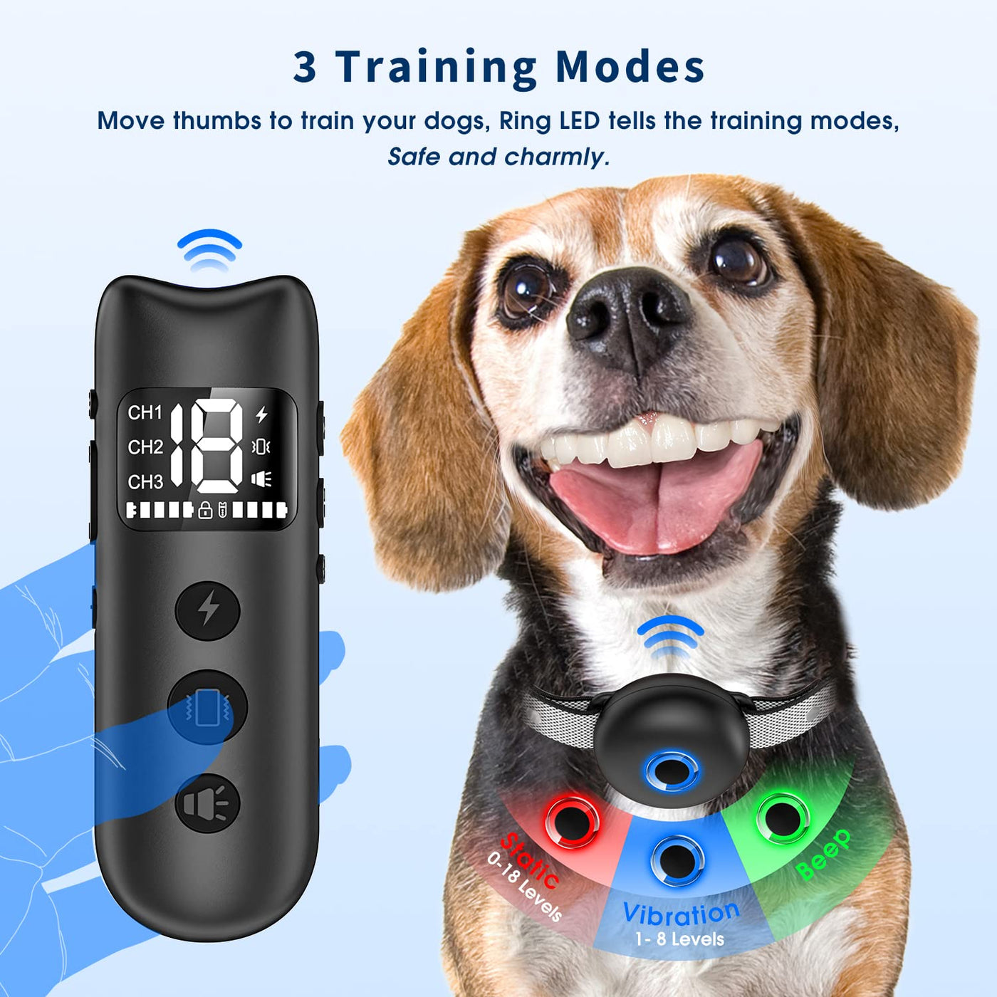 - 3 SAFETY MODES - The electric collar has 3 training modes beep/vibration/static shock, can displays related ring LED colors on receiver. So it can stop dogs barking/fighting etc. safety, effectively, charmingly.